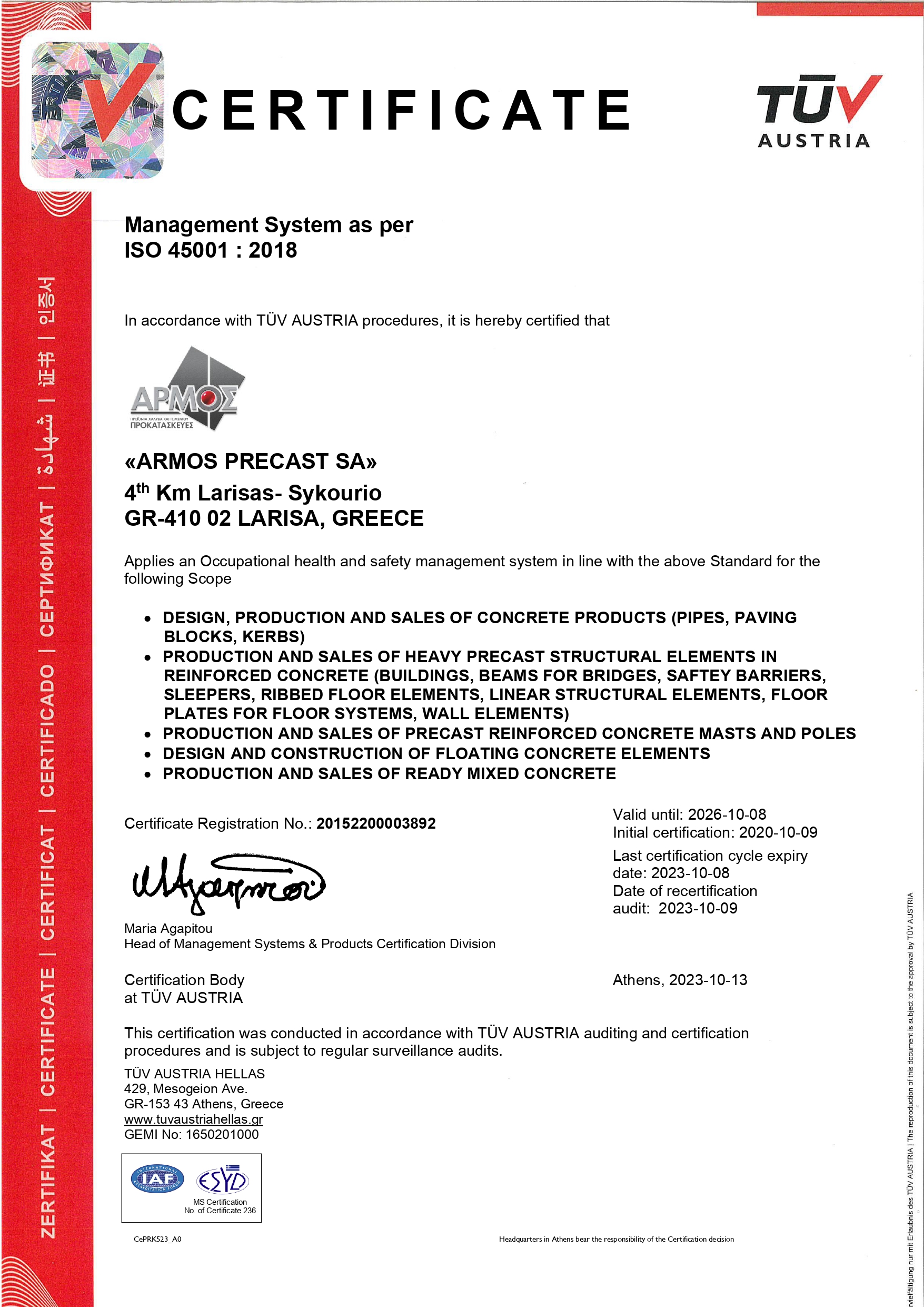 Η εταιρία δεσμεύεται για τη μείωση των επιπτώσεων της λειτουργίας της στο περιβάλλον, καθώς και για την προστασία της ασφάλειας και υγείας των εργαζομένων της, μέσω της εφαρμογής Συστήματος Περιβαλλοντικής Διαχείρισης σύμφωνα με το πρότυπο ISO 14001:2015 και Συστήματος Διαχείρισης για την Υγεία και Ασφάλεια στην Εργασία σύμφωνα με το πρότυπο ISO 45001:2018 αντίστοιχα.