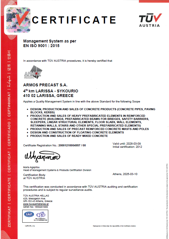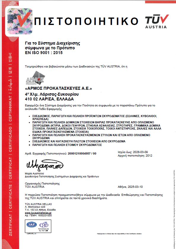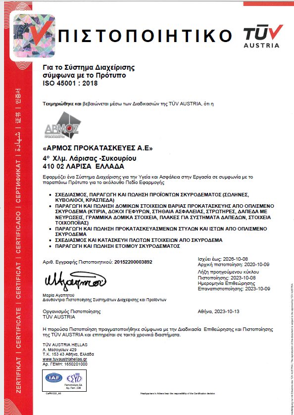Η ΑΡΜΟΣ εφαρμόζει Σύστημα Διαχείρισης Ποιότητας σύμφωνα με το πρότυπο ISO 9001:2015 και φέρει σήμα ποιότητας CE για όλα τα προϊόντα της.