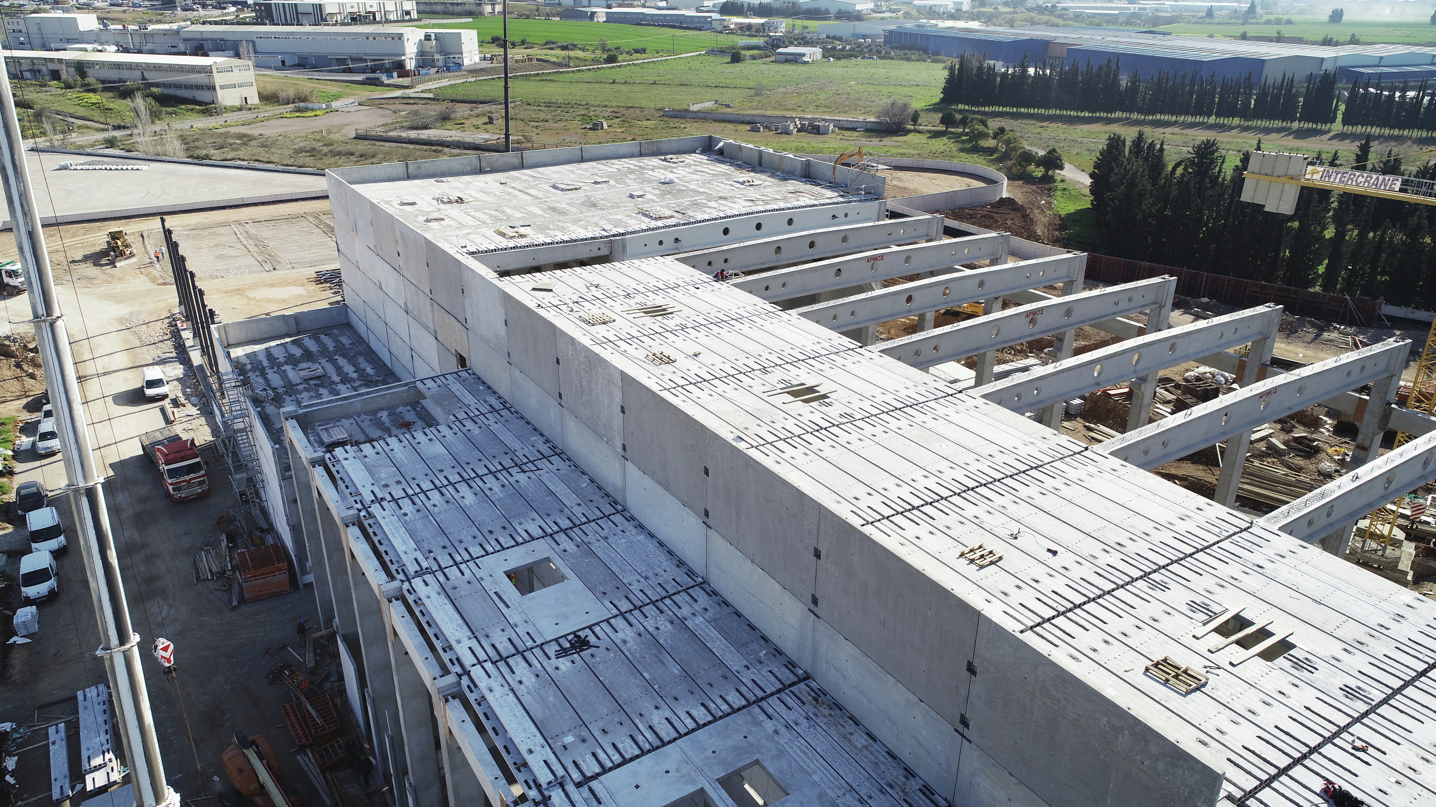 Περισσότερα από 4.000 τ.μ. από προκατασκευασμένες πλάκες με διαμήκεις οπές (Hollow Core Slab – HCS), ύψους 200mm χρησιμοποιήθηκαν για την κατασκευή δαπέδων ημιώροφου και στέγης του νέου Εργοστασίου Χαρτιού της Intertrade – φάση 1, στα Οινόφυτα Βοιωτίας.